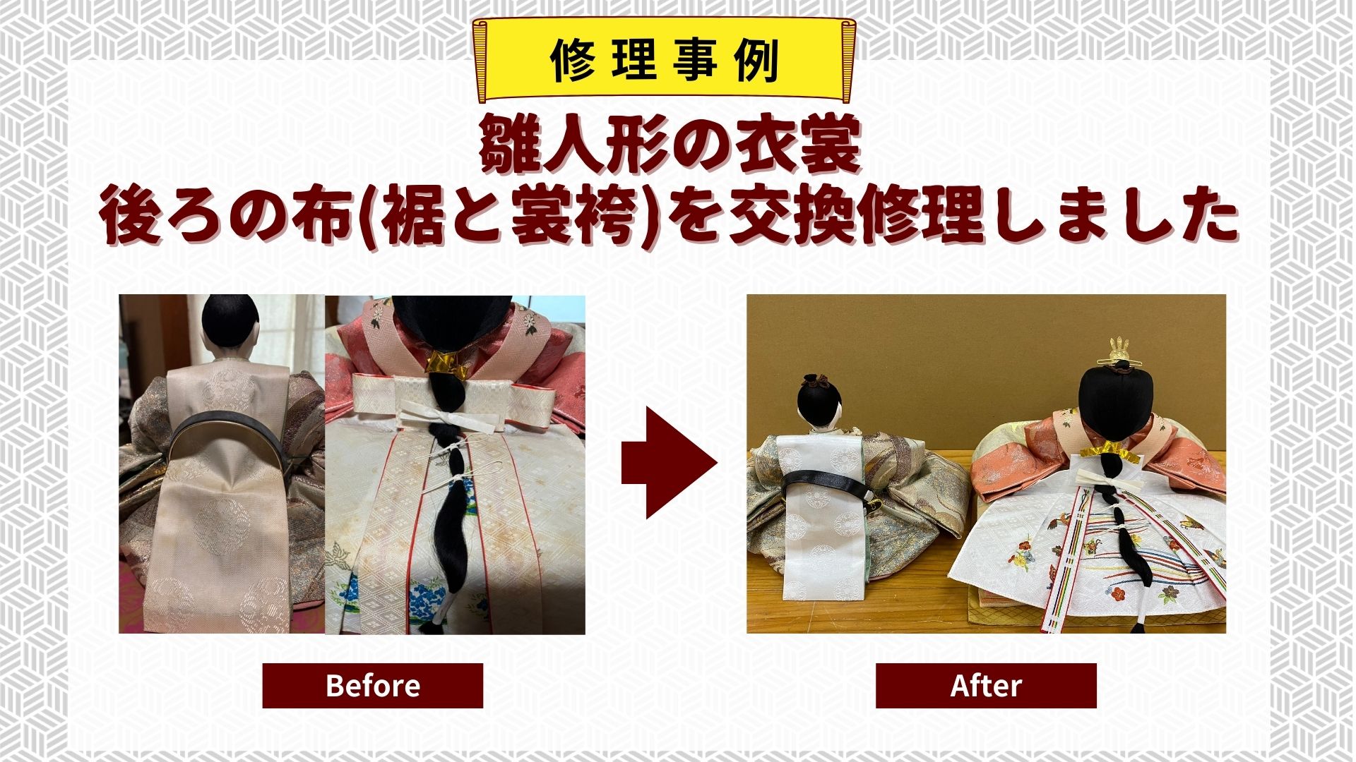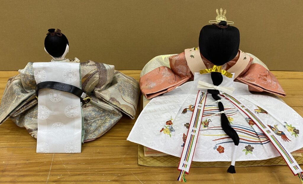 お殿様の裾、お姫様の裳袴を交換し美しい姿を取り戻すことができました。