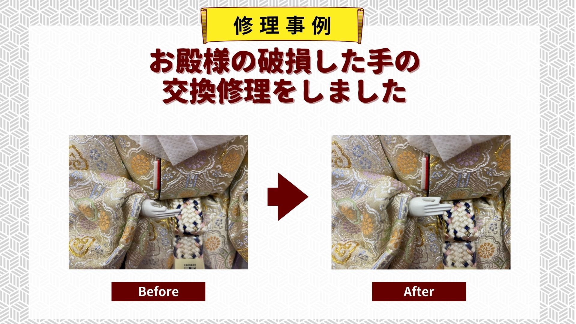雛人形の手が破損してしまった場合、倉片人形までご相談ください